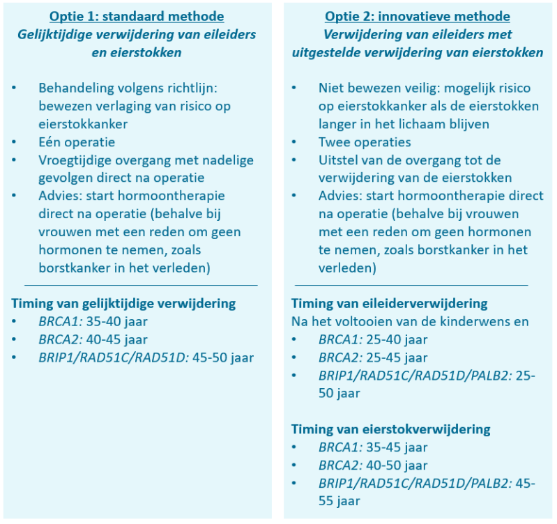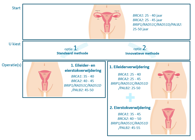 Vrouwen met een genmutatie (= verandering in het DNA, ook wel pathogene variant genoemd) in het BRCA1, BRCA2, BRIP1, RAD51C of RAD51D gen krijgen het advies om de eileiders en de eierstokken tegelijk weg te laten halen. Omdat het risico op eierstokkanker stijgt met de leeftijd, moet deze preventieve operatie worden uitgevoerd vóór de leeftijd waarop de kans op eierstokkanker gaat stijgen. Daarom krijgen vrouwen met een BRCA1 genmutatie het advies tegelijk de eileiders en eierstokken te laten weghalen tussen de leeftijd van 35 en 40 jaar; vrouwen met een BRCA2 genmutatie tussen de leeftijd van 40 en 45 jaar; en vrouwen met een BRIP1, RAD51C, of RAD51D genmutatie tussen de leeftijd van 45 en 50 jaar.